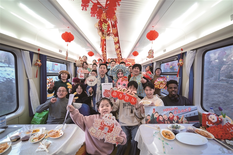 今年春節(jié),蘭州客運(yùn)段在k132次列車上舉辦了“非遺走進(jìn)春運(yùn)車廂,文化點(diǎn)亮跨年旅途”列車春晚活動(dòng)。列車上邀請(qǐng)了具有甘肅特色的太平鼓、剪紙技藝、天水刺繡的非物質(zhì)文化遺產(chǎn)代表性傳承人在列車上為大家進(jìn)行展示,并和旅客互動(dòng),還有秦腔傳承人為大家?guī)?lái)酣暢淋漓的表演,民族風(fēng)采的舞蹈《騰騰蛟起鳳》、網(wǎng)絡(luò)熱舞《APT》、自編自唱說(shuō)唱版《映山紅》,以及2024年在蘭州非常火的“黃河大合唱”。最后,工作人員和旅客一起包餃子、吃餃子、送祝福,為列車文化活動(dòng)畫上圓滿的句號(hào)。
