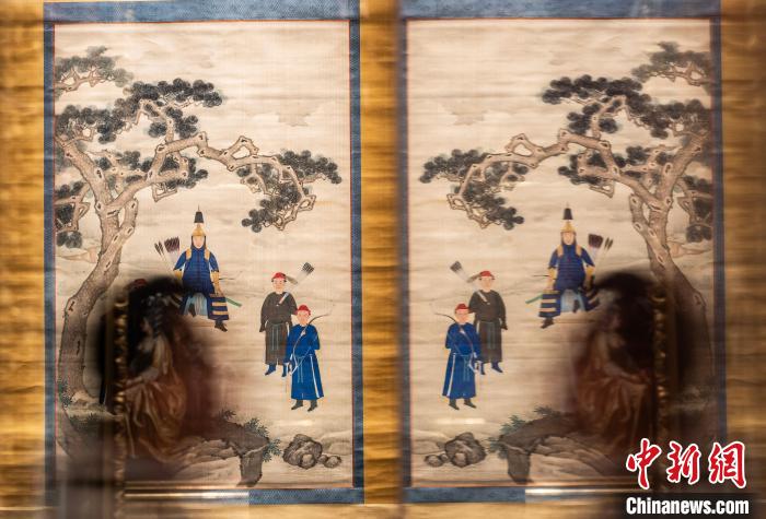 圖為故宮博物院藏《雍正帝朝服像》《康熙帝戎裝像》《孝莊文皇后朝服像》(右一起)和法國《路易十四肖像》(左一)同廳展示。中新網記者 侯宇 攝
