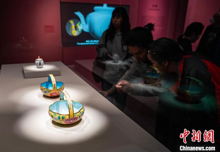 圖為故宮博物院藏“牡丹紋海棠式花籃”展品吸引觀眾參觀。中新網記者 侯宇 攝