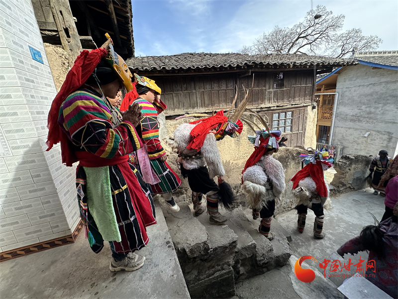 在白馬語言中,“池哥”意為山神,“晝”即舞。每年春節(jié)期間,文縣白馬山寨都會表演池哥晝,舞隊一般由9人組成,其中4人扮成山神(池哥),2人扮成菩薩(池姆),2人扮成夫妻(池瑪),還有1個兒童扮成猴娃子。他們從早到晚挨家逐戶地表演,意在為村民除惡祛邪,祈求吉祥。表演時,舞者頭戴青面獠牙的木雕彩繪面具,身著特色服飾,舞步遒勁粗獷,舞姿有殺野豬、打老虎等動作,既帶有神秘的氣息,又顯示出濃厚的娛樂色彩。