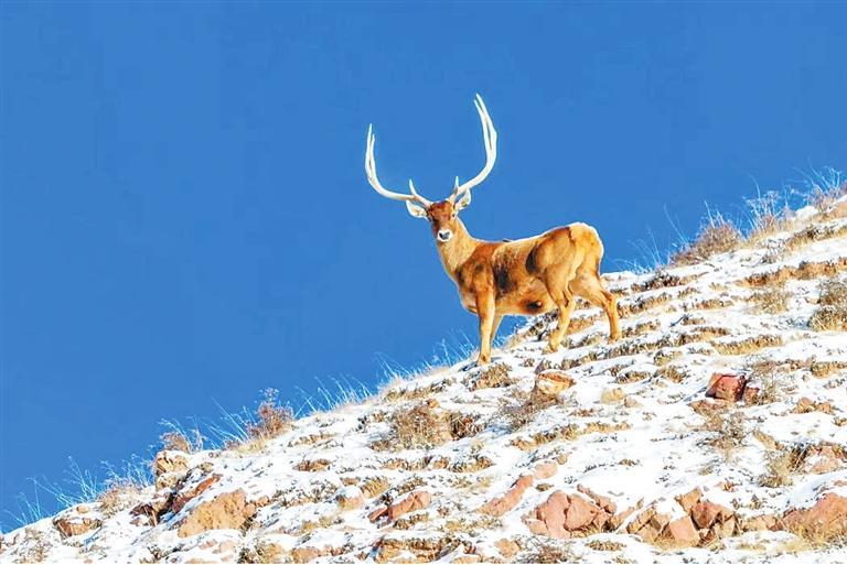 白唇鹿,是國家一級保護野生動物,中國特有鹿種,主要分布在青藏高原及其邊緣地帶的高山草原地區,為典型的高寒物種,在當地老百姓眼中被視為“神鹿”。白唇鹿嘴唇的周圍和下頜為白色,故得名。