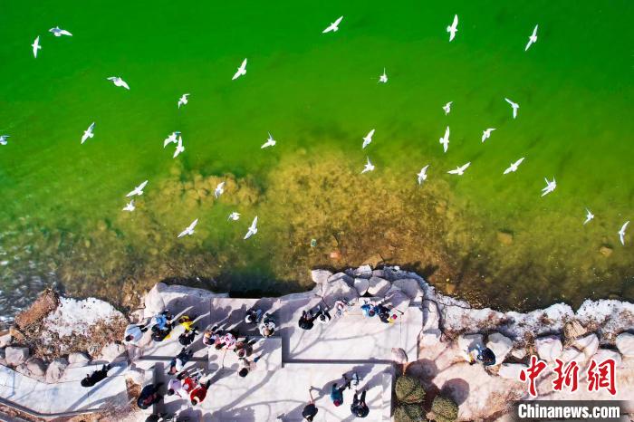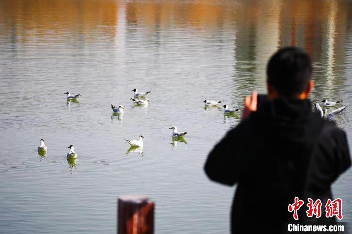 紅嘴鷗現身銀川燕鴿湖畔,吸引市民游客駐足觀賞。馬楠 攝