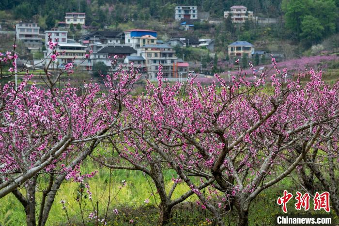 3月15日,在廣西田林縣浪平鎮浪平村,滿樹桃花與錯落村舍相互映襯。黃數情 攝