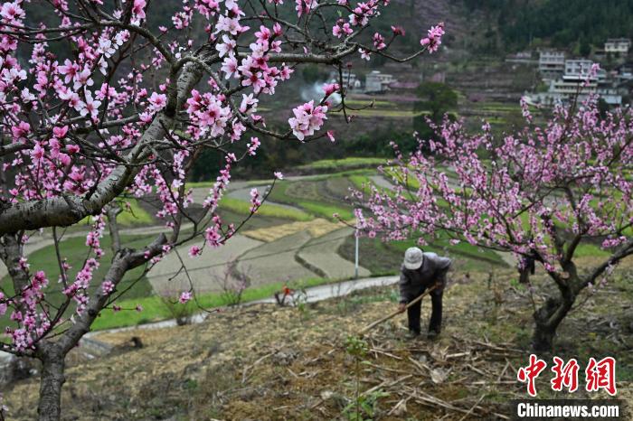 3月15日,在廣西田林縣浪平鎮浪平村,村民在桃樹下勞作。黃數情 攝