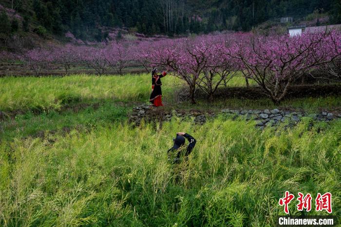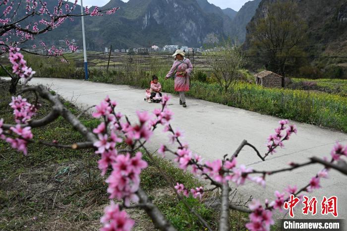時下正是桃花盛開的時節,在廣西田林縣浪平鎮浪平村,村民種植的桃花競相綻放。滿樹繁花與錯落村舍相互映襯,還有樹旁玩耍的孩童、樹下勞作的村民,動靜交織,構成一幅絕美的田園春景圖。圖為3月15日,在廣西田林縣浪平鎮浪平村,村民在桃樹下勞作。黃數情 攝