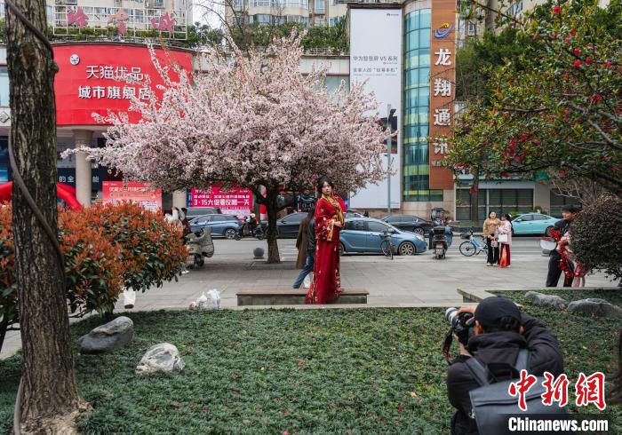 圖為3月16日,棠湖公園正大門處,垂絲海棠盛開,市民在此拍攝寫真照。韓金雨 攝