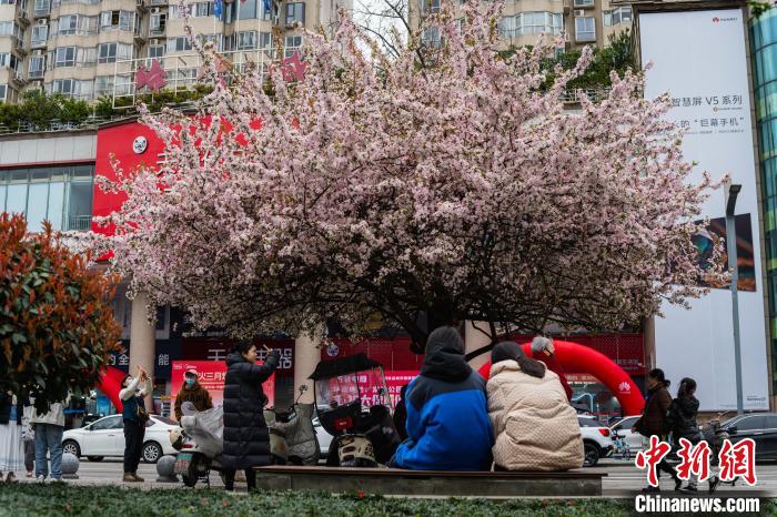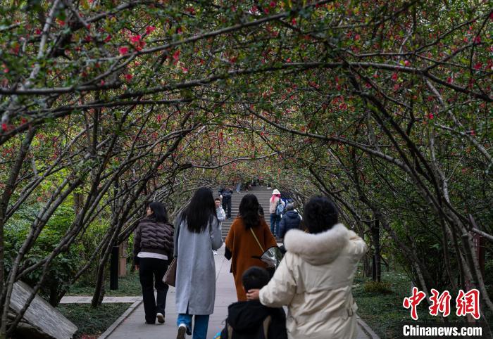圖為3月16日,市民行走在棠湖公園內的“海棠花道”上。韓金雨 攝