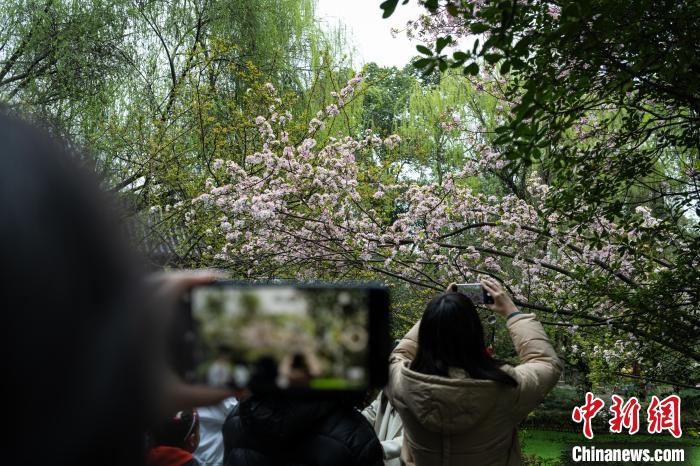 圖為3月16日,棠湖公園內,垂絲海棠盛開,市民爭相拍照打卡。韓金雨 攝