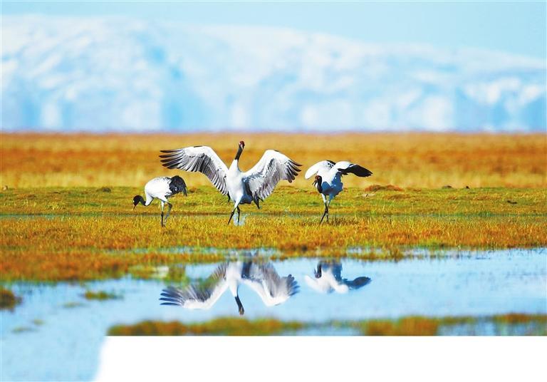 尕海湖的晨霧尚未散盡,黑頸鶴的赤紅色頭頂已經開始閃現。它們在苔草間跳起求偶之舞,頭頂的朱紅隨舞步明滅,如同螢火蟲的閃光。新孵化的雛鶴,棕黃色絨羽間染著乳白,是大地贈予新生命的第一抹色彩。這種國家一級保護動物蹣跚學步時,總被親鳥用長喙輕推,這場景會令保護區巡護員想起女兒初學自行車時自己的緊張。