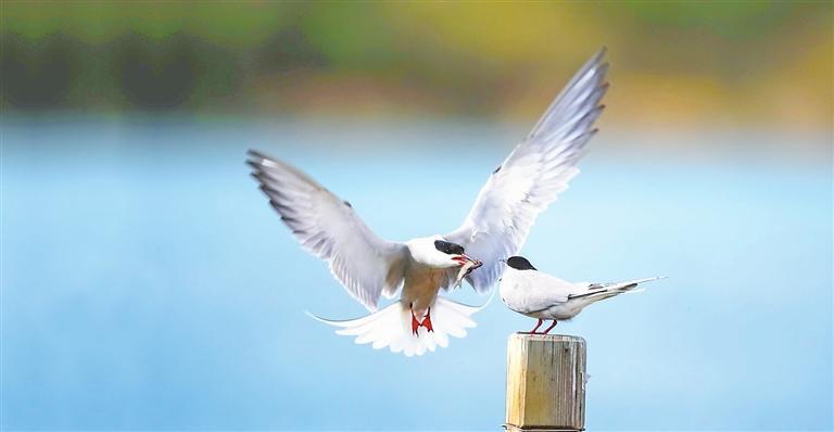 同屬鷗類大家族,漁鷗的體型要比普通燕鷗大得多。換上了黑色頭羽的繁殖期成體,張開那約一米半的雙翅,頗顯幾分霸氣。可它竟強盜成性,選擇劫掠其他水鳥。盜獵時翼尖滴水,以橘紅色喙尖刺中燕鷗的魚獲。一瞬間,生存競爭的殘酷與生命的頑強在這一刻達成了奇妙的平衡。