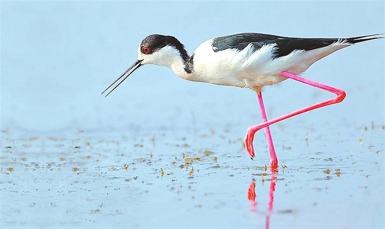 黑翅長腳鷸靜立淺灘時,恍若隨手放置的抽象雕塑——血紅色長腿占體長的三分之二,又仿若踩著高蹺的芭蕾舞者,每一步都能踏碎水面的金色霞光。一窩繁殖失敗的親鳥開始了第二次嘗試,它們將巢穴鋪設在湖畔,簡陋的碟狀巢,宛如浮于沼澤中的小舟。巢中往往是四枚橄欖色的梨形卵,點綴著不規則的黑褐色斑紋。雌雄輪流孵化,盡顯溫情。它行走時步履如詩般閑逸,卻在奔跑中暴露出笨拙的一面,如優雅與窘迫并存。當觀鳥者的影子掠過濕地,它便以頭顱叩擊空氣作警鐘,繼而振翅離去。