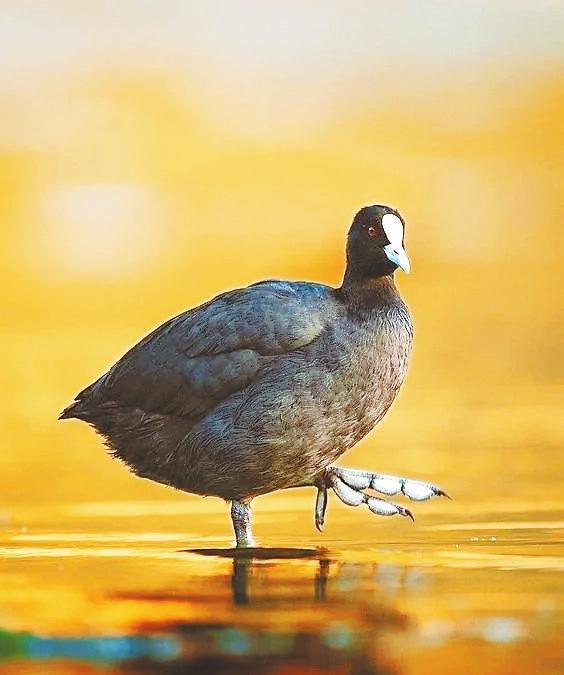 白骨頂又被喚作骨頂雞,卻是鶴類的遠親。它靜浮水面時,額前一抹象牙白,宛若遺落人間的墨玉鎮紙。這枚額甲實為特化的角質層,是為了保護頭部的盔胄。灰白色的瓣蹼如雪地靴般包裹趾間,劃開水藻時泛起粼粼波光——這身黑羽配雪蹼的穿搭,竟比時裝周的極簡主義更先鋒。當它們列隊掠過蘆葦蕩,水淼勾勒的剪影里,仿佛在繪制著秋天的信箋。