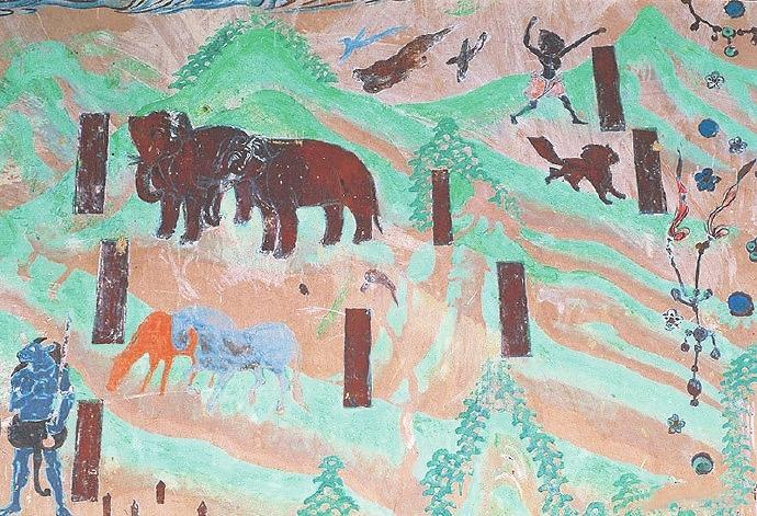 另外,莫高窟第85窟壁畫中還有一幅“行獵圖”形象地反映了狩獵的情景:畫面上四個健碩的獵人正在整裝出獵,他們著裝統一:頭戴幞頭,身穿缺胯衫,足蹬半腰靴。有人胳臂上駕鷹、有人單手牽犬、有人持弓挎箭囊,甚至還有一人手持利斧。