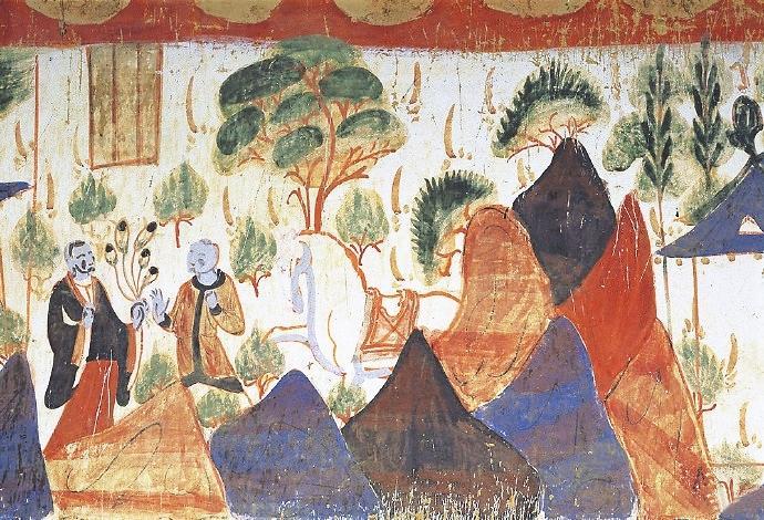 在敦煌壁畫中有關對弈的內容較多。在莫高窟第454窟、第7窟壁畫中都有“弈棋圖”。兩幅圖的畫面有不少類似的地方:一是畫師較為突出棋盤的位置,兩幅壁畫中的棋盤都居中且形制相對巨大;二是畫面上的人物均為三人,兩人對弈,一人觀戰,“觀棋不語真君子”;三是對弈者身后的景色都是天朗氣清、遠山含黛。據說,一天,北宋大文豪蘇東坡與摯友黃庭堅正在松樹底下弈棋。一陣風吹來,松果掉進棋盤。蘇東坡隨即吟道:“松下圍棋,松子每隨棋子落。”黃庭堅馬上回答道:“柳邊垂釣,柳絲常伴釣絲懸。”雅趣十足。其實,棋局里的一動一靜、一招一式無不需要謹小慎微、穩扎穩打。而對弈時的當斷則斷、示假隱真、有效合作等戰術不僅是對弈的智慧,也是人生的哲理吧。