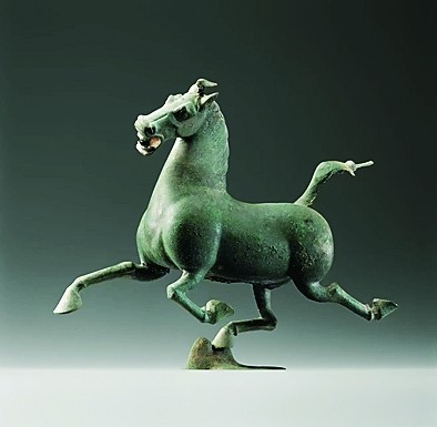 走進甘肅省博物館,這匹東漢神駒,仿佛正在飛馳,攫住了所有人的目光——它全身呈流線型,肌肉健碩有力。它的口、眼、鼻均張開,三足騰空而起,一足踏于飛鳥之上,在飛鳥回首驚顧的一剎那,它已超越流星般飛行的鳥向前而去。馬的奔騰嘶鳴和風的呼嘯猶在耳畔,這個風馳電掣的瞬間也被定格成永恒。